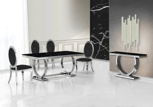 Salle à manger marbre noir et chaises médaillon velours noir chromé BOBO
