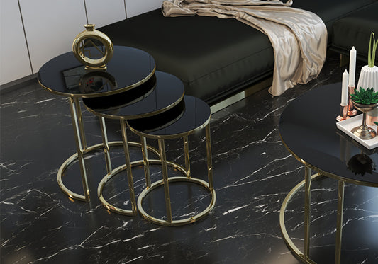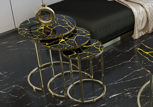 Siyah Statik Siyah Mermer Desenli Kırılmaz Camlı Metal Zigon Sehpa MORA