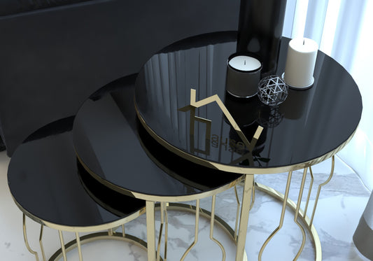 Siyah Kırılmaz Parlak Camlı Telli Gold Metal Zigon Sehpa MELODİ