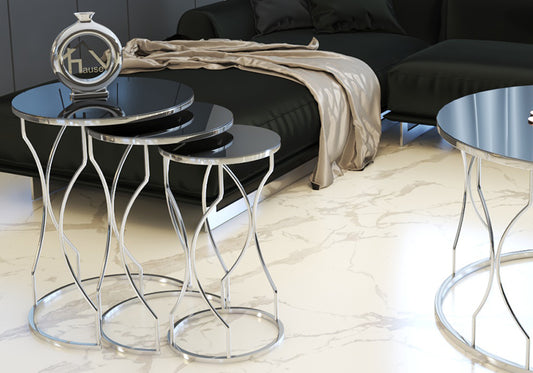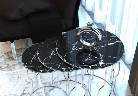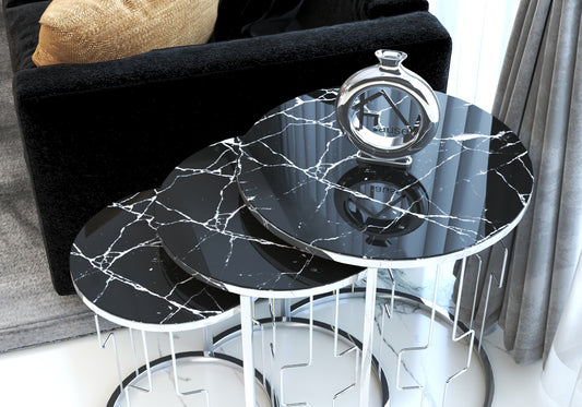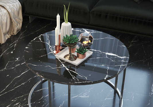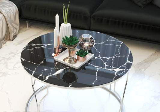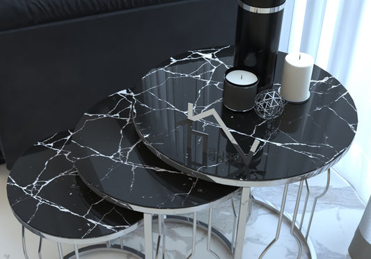 Siyah Mermer Parlak Kırılmaz Camlı Gümüş Metal Zigon Sehpa MELODİ