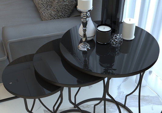 Siyah Parlak Kırılmaz Camlı Gümüş Metal Zigon Sehpa MELODİ