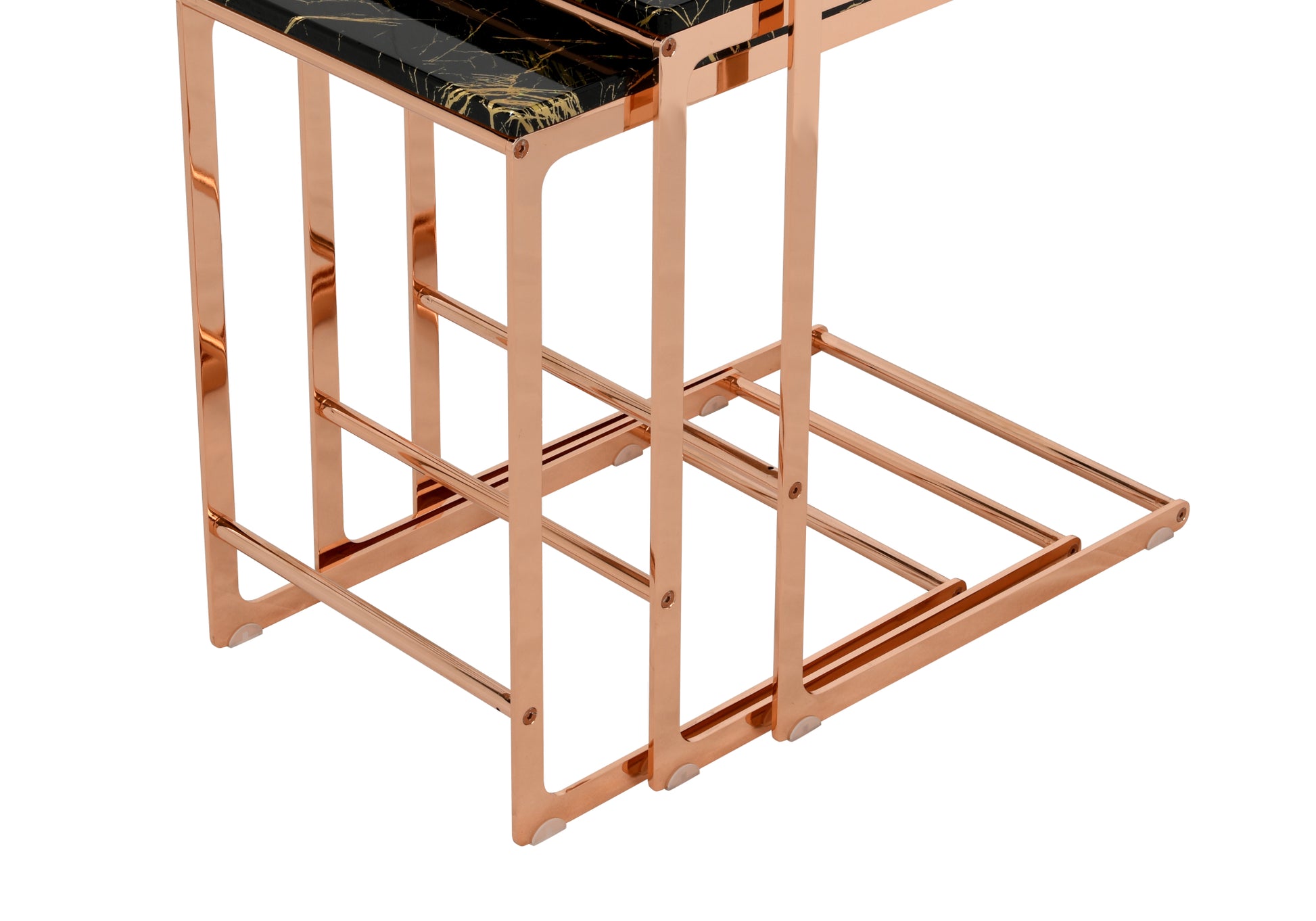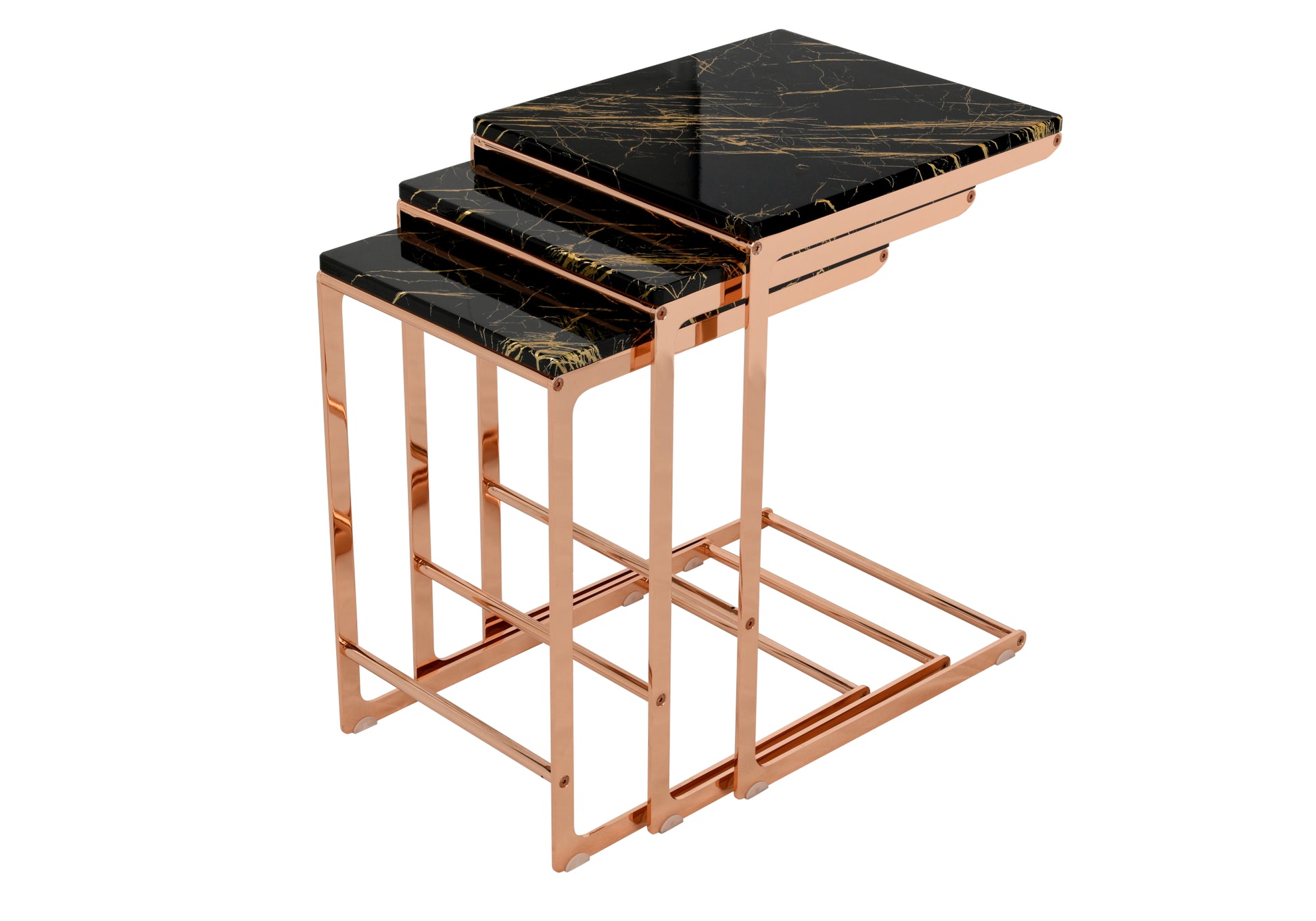 Sehpa üst kısmı siyah-gold parlak MDF'den üretilmiştir. Kenarları ve ayakları bronz renk kaplı metalden olup, şık C ayak tasarımıyla dikkat çeker. 3 parça halinde gelen bu sehpa, iç içe geçerek minimum yer kaplar. Hem tasarımıyla hem de malzeme kalitesiyle uzun yıllar boyunca evinizde yer bulacak bir üründür.