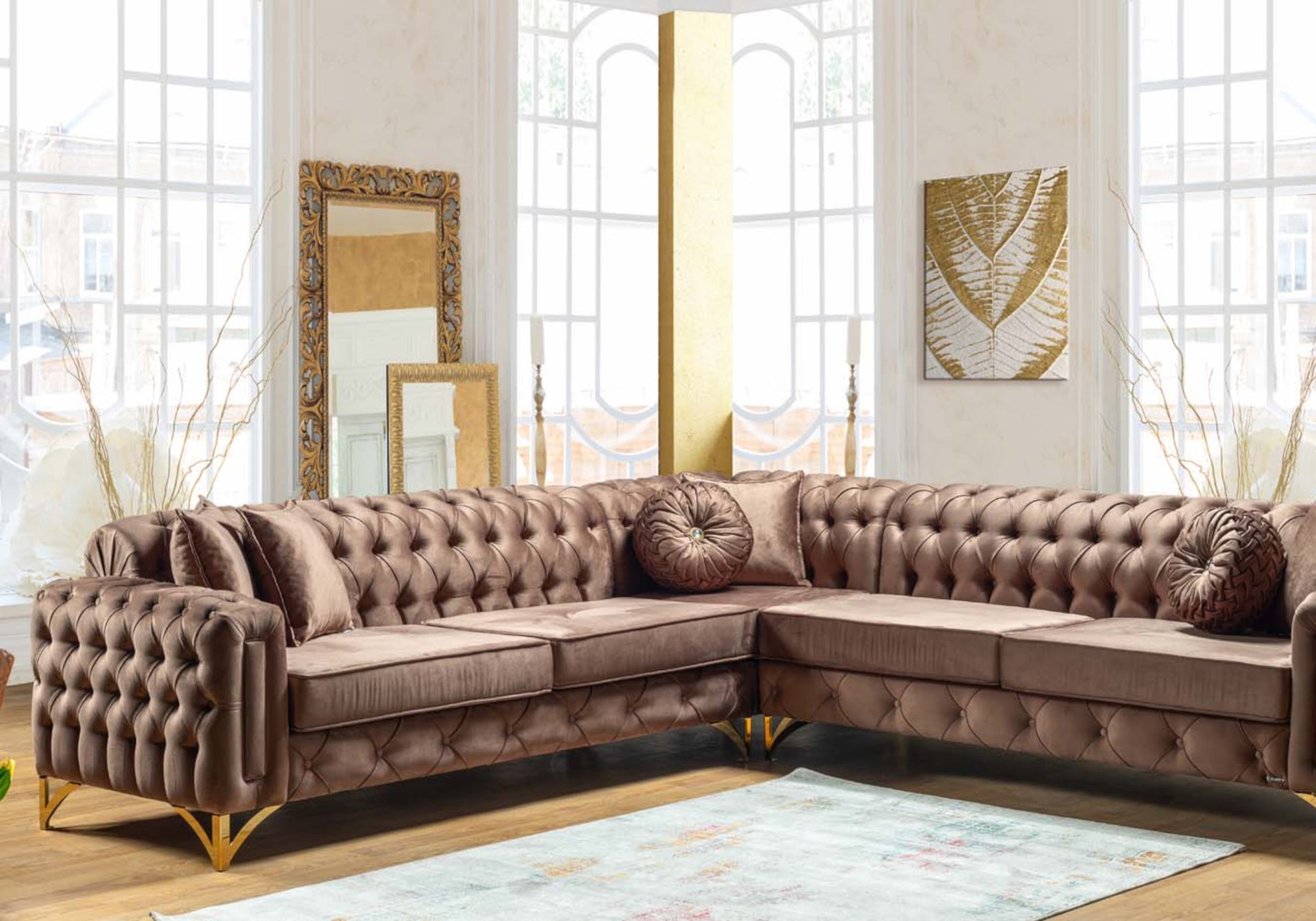 Chester Kahve ÇINAR Köşe Koltuk, konforu rahatlığı ve keyif almayı bir arada sunar. Kaliteli, sağlam ve şık bir tasarıma sahip olan bu köşe takımı, gösterişli ve ihtişamlı bir görünüm sunar. Modern ve kahve rengi tasarımı ile evinizin her köşesine uyum sağlar. Zarif ve ergonomik altın renkli ayak tasarımı, farklı kumaş stili ve aynı zamanda fonksiyonel köşe takımı özellikleri ile hem göz doldurur, hem de kullanım kolaylığı sunar. Kolay temizlenebilen ve pratik bir tasarıma sahip olan Chester Kahve ÇINAR Köşe Koltuk, evinizin her köşesinde konfor ve şıklığı bir arada sunar.