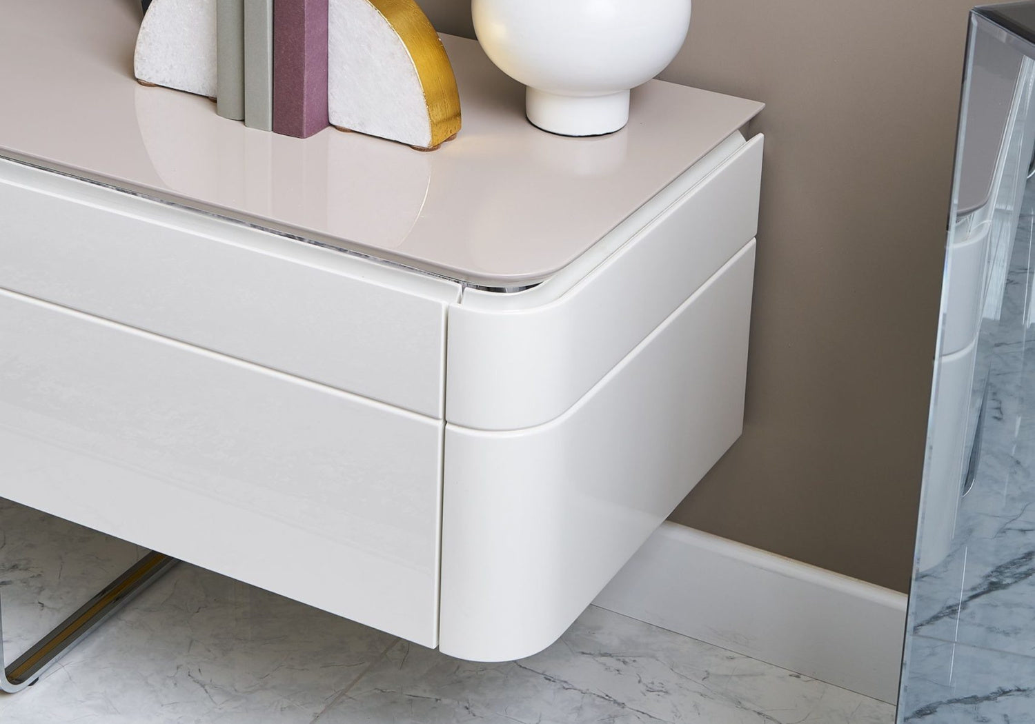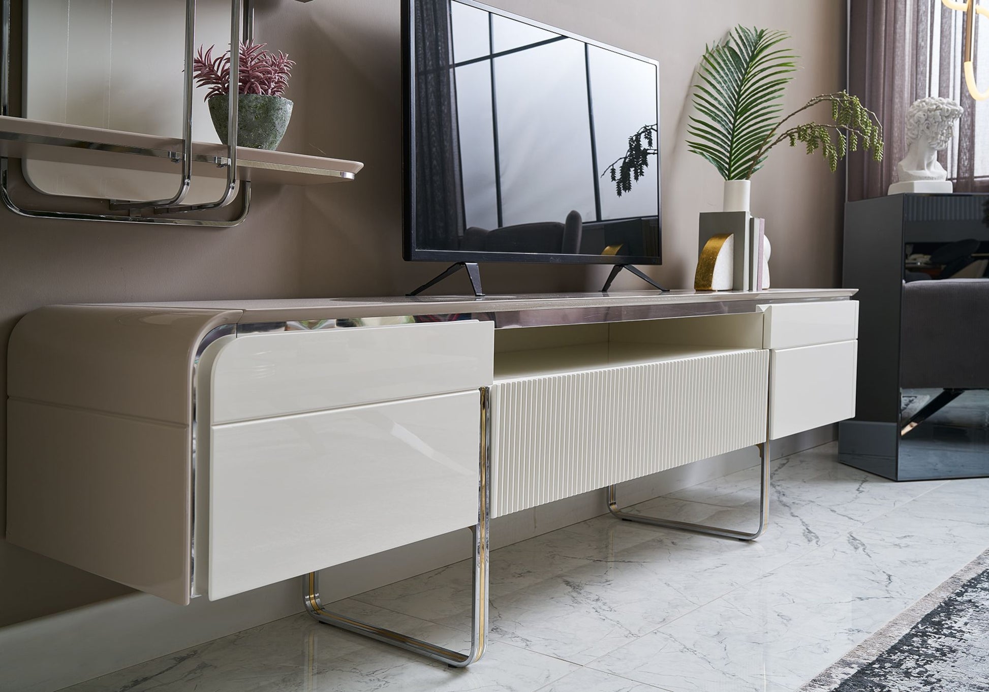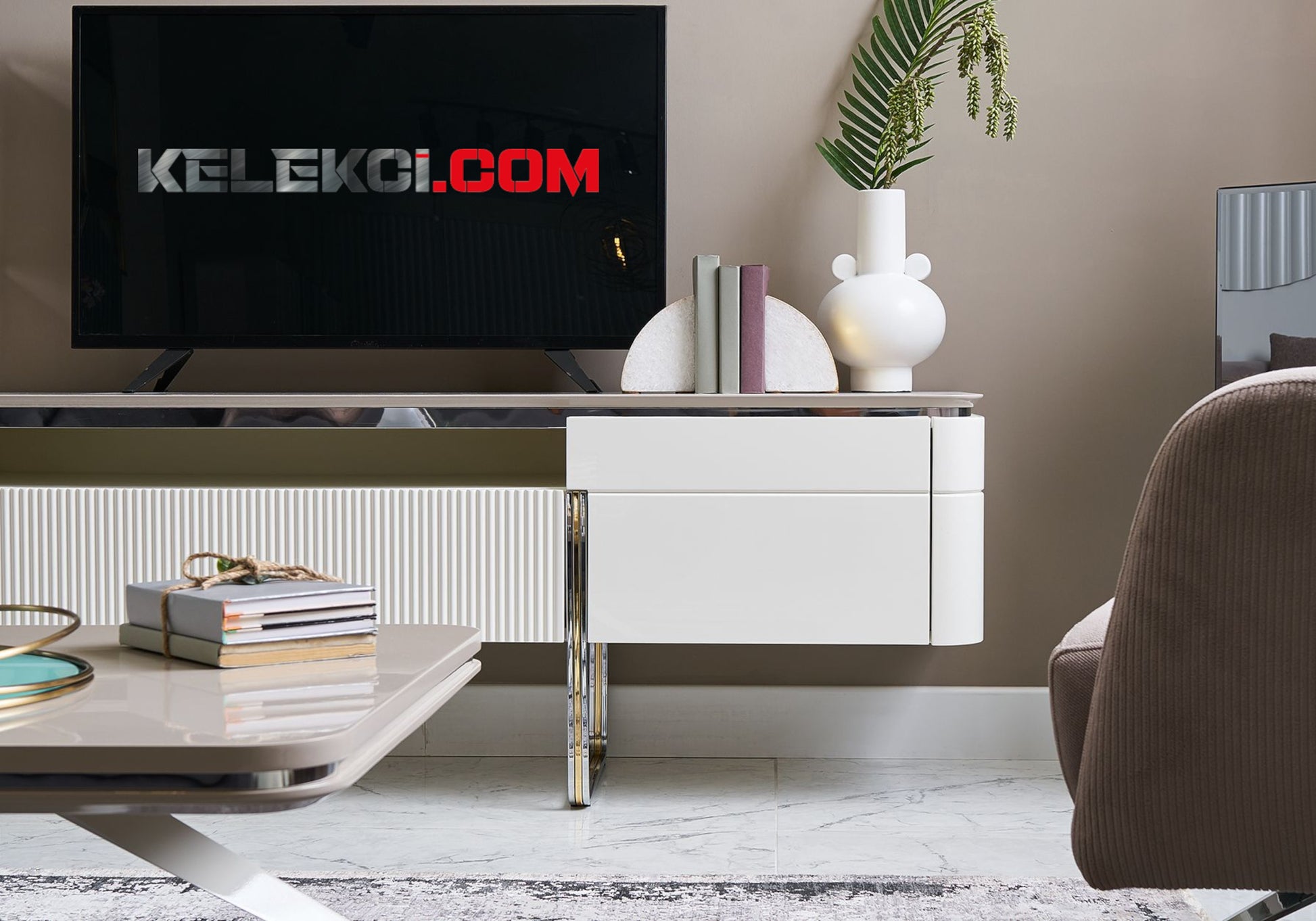 ARES TV Ünite Seti, modası asla geçmeyen modern ve şık çizgileriyle evinizde etkileyici ve farklı bir kontrast yaratır. Gümüş detaylar ve ahşap işlemeli kapaklar, üniteye zarif bir dokunuş katar. Oval köşeler ve çapraz ayaklar, modern bir estetik sunar. Yerden yüksek ayakları ve geniş çekmeceleriyle, günlük hayatınızda kolaylık sağlar. Bu TV ünitesi, hem sunduğu sadelik hem de dönemin çizgilerini yansıtan şıklığı ile bir bütünlük sağlar.