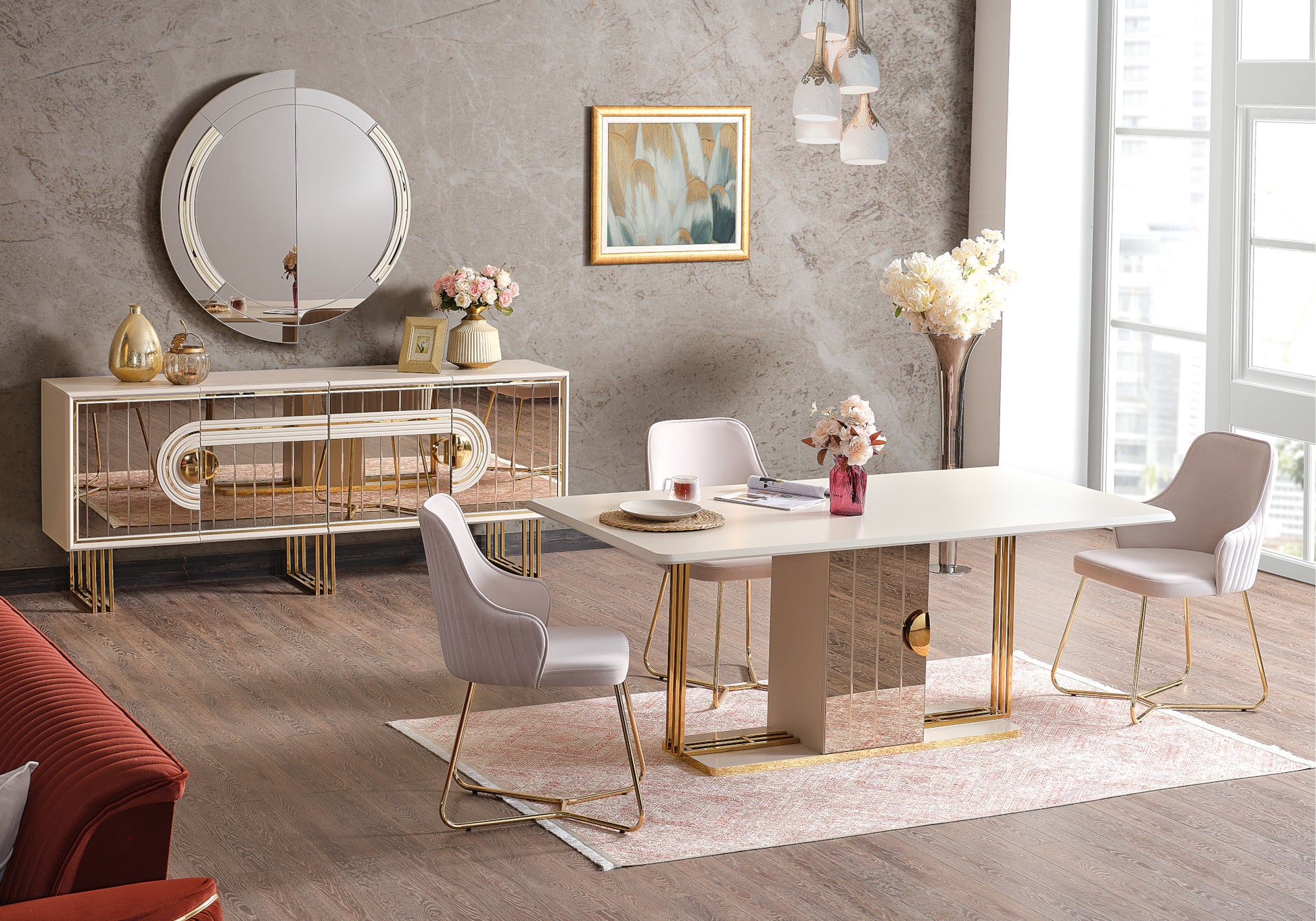 LOTUS yemek odası takımı, gold ve beyazın mükemmel uyumunu yansıtarak evinize sofistike bir hava katıyor. Gold renkli ayaklar, kulplar ve ayna detayları, modern ve zarif bir görünüm kazandırıyor. Sandalye ve masanın ayak tasarımları, detaylı işçilik ve kaliteli malzemelerle birleşerek evinize modern ve lüks bir dokunuş katar. Bu takım, estetik ve fonksiyonelliği bir araya getirerek mükemmel bir yemek odası deneyimi sunar.