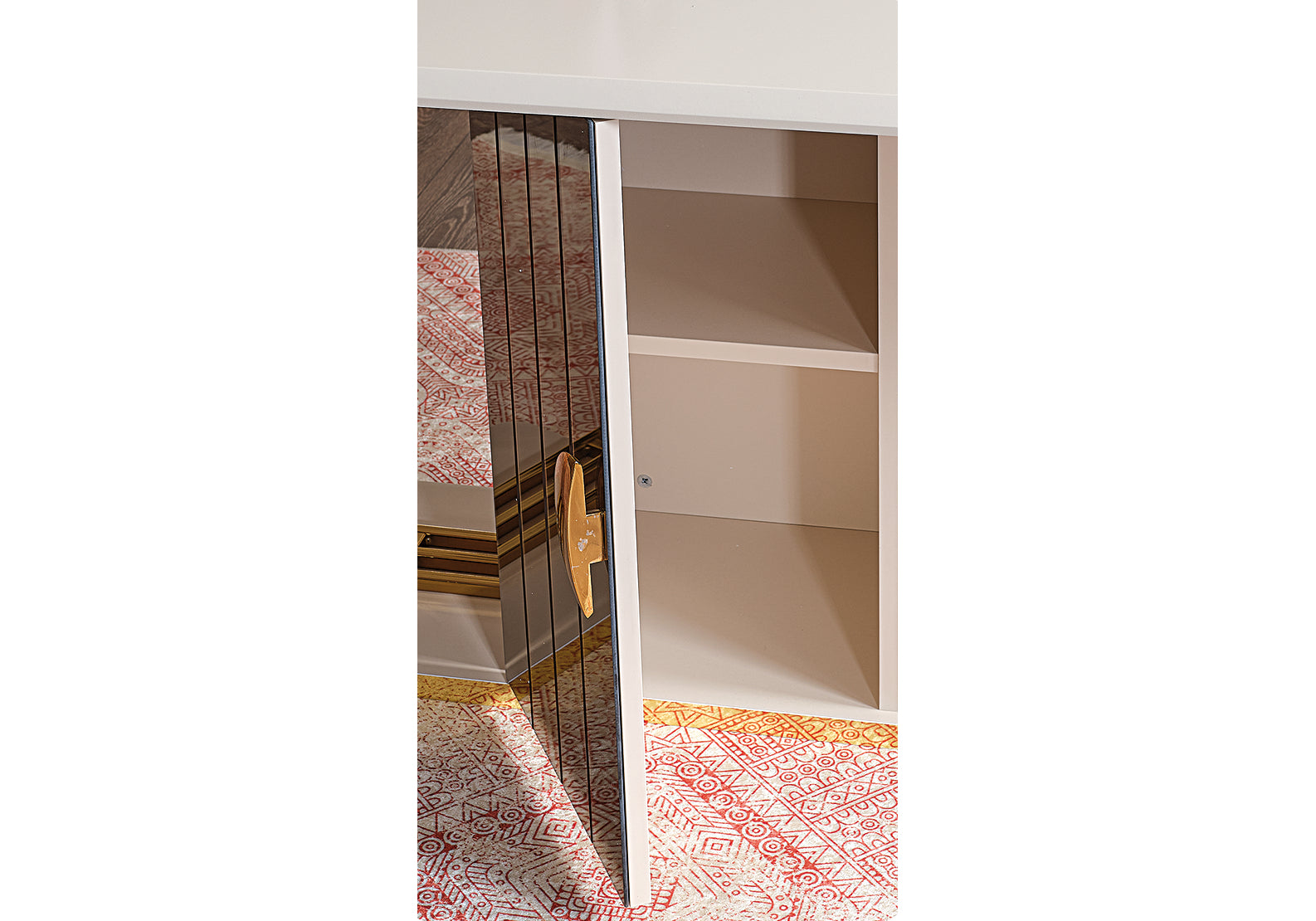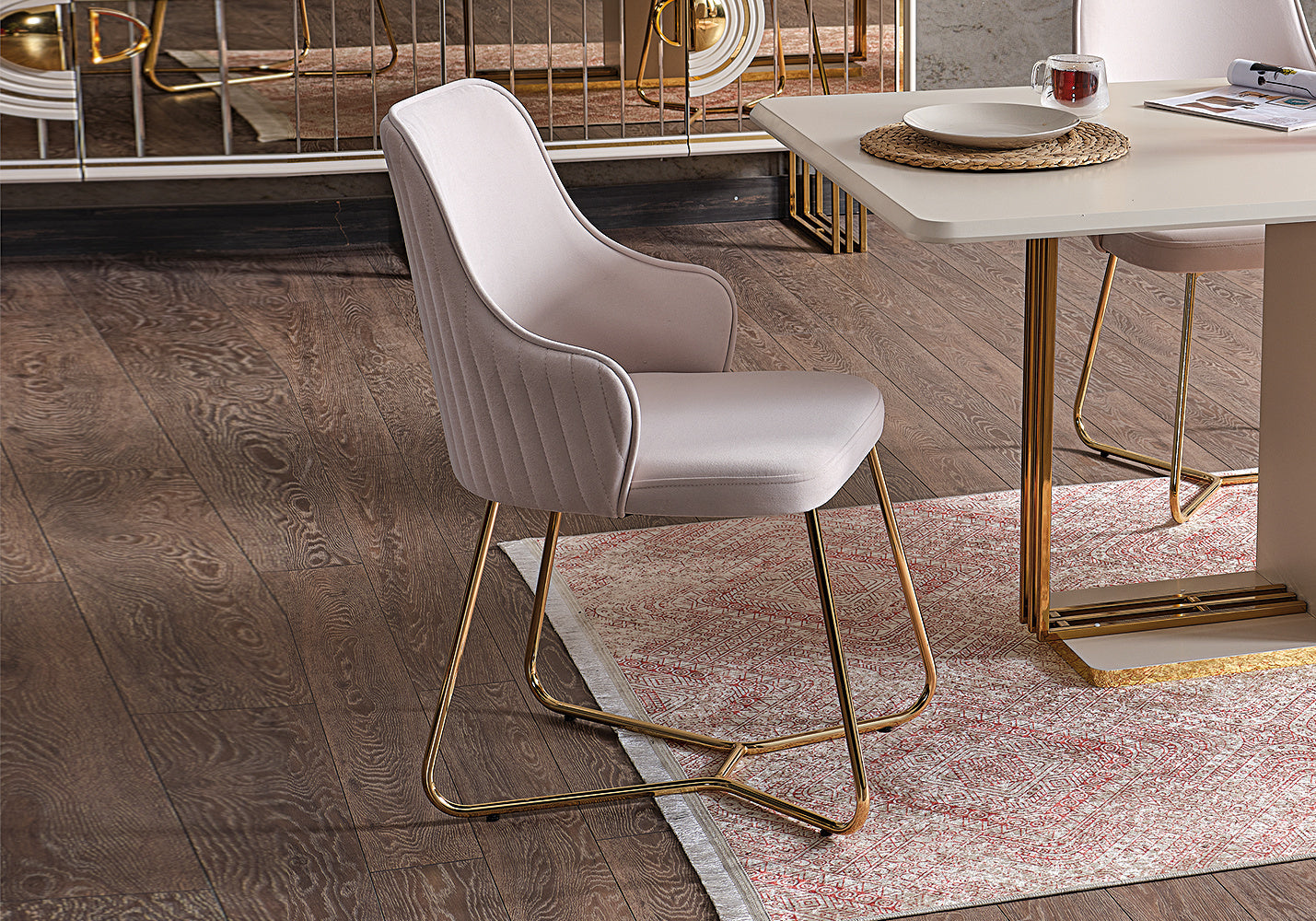 LOTUS yemek odası takımının en dikkat çekici özelliklerinden biri, beyaz ve gold detaylarının mükemmel uyumudur. Beyaz renkli yemek masası, gold ve ayna detaylı ayaklarıyla hem şık hem de fonksiyonel bir görünüm kazanıyor. Masanın ayaklarında bulunan saklama alanı, ekstra depolama imkanı sunarak kullanışlılığı artırıyor. Konsol ve sandalye ayaklarındaki gold renk, konsoldaki ayna ve zarif çizgi detaylarıyla birleşerek lüks ve modern bir atmosfer yaratıyor.